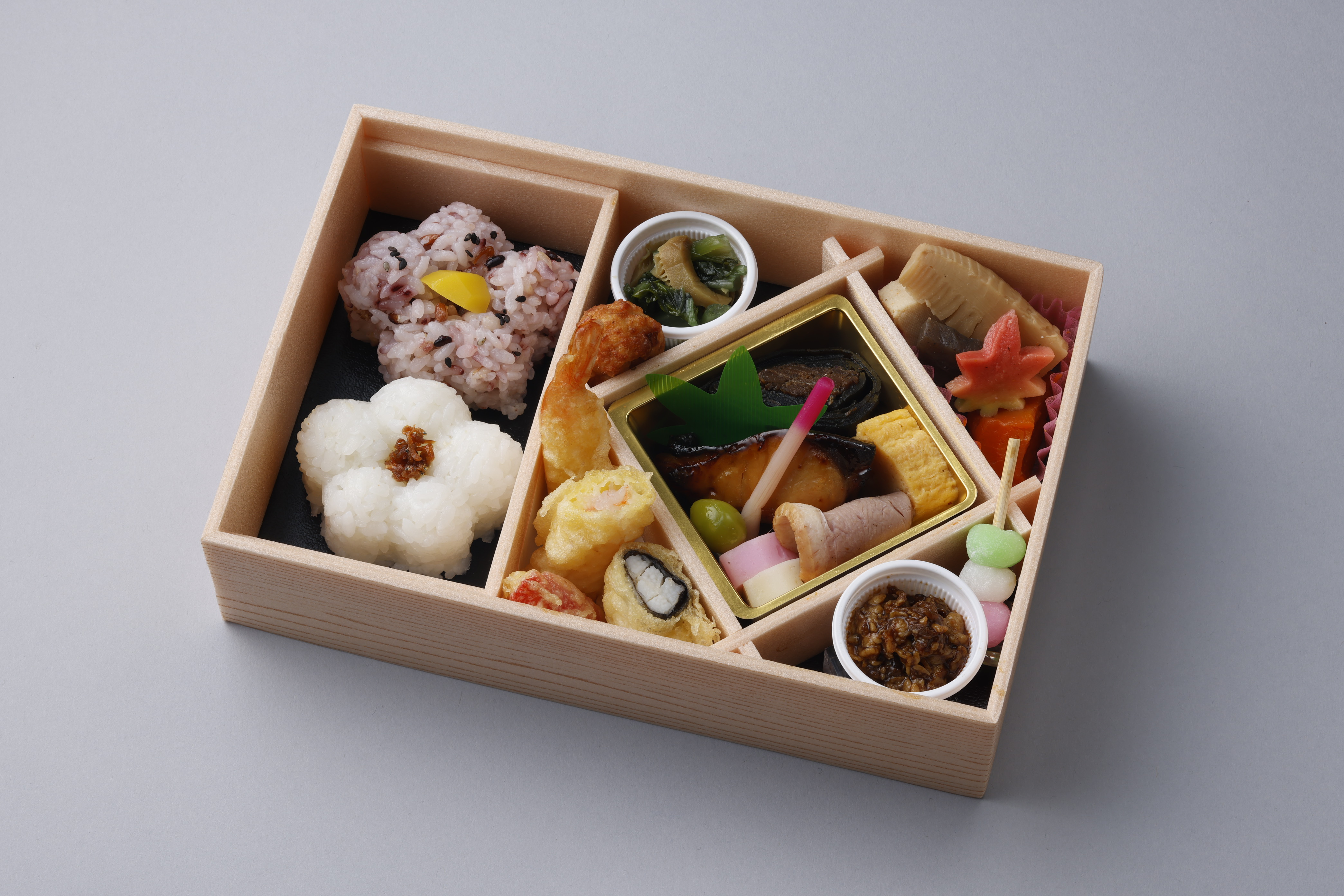 海老天 カニスティック天 山芋磯辺天 抹茶塩 煮物(高野豆腐・たけのこ・人参・こんにゃく・花麩)牛しぐれ 3色串団子 にしん昆布巻 小巻玉子 銀ヒラス照焼 鴨ロース 小袖紅白 ハジカミ ぎんなん揚げ 赤飯 ごましお 栗小 白梅 じゃこ